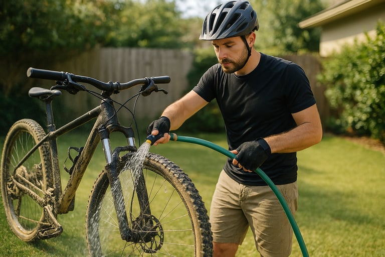 Imagem: Freepik - Ciclista lavando bicicleta com água doce no quintal após pedalar na areia, prevenindo ferrugem
